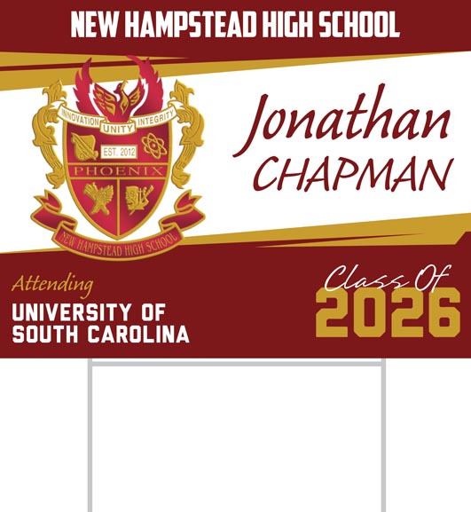 ClassOfYardSigns.com is the leading recognition and motivation expert! We are here to celebrate your academic achievement with custom yard signs. These New Hampstead High School graduate yard signs are the perfect addition to any home and are a great way to let your friends, family and neighborhood know you have made it!